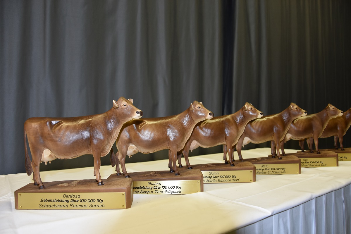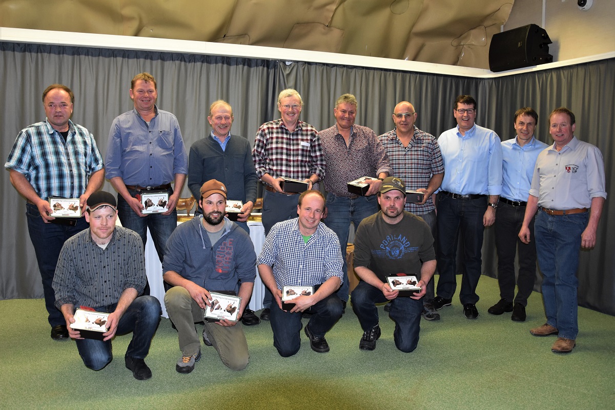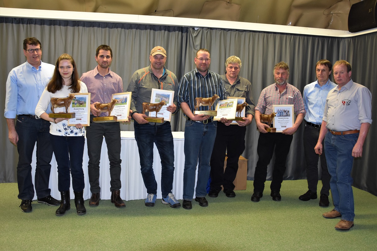 Insgesamt sieben Zuchtfamilien durften 2017 präsentiert werden. Der OB-Stier Hakon von Thomas Schrackmann wird zurzeit breit eingesetzt. Zwölf Betriebe schafften es 2017 auf die von Braunvieh Schweiz geführte Betriebsmanagement-Liste. Eine Lebensleistung von über 85`000 kg Milch erreichten im vergangenen Jahr zehn Obwaldner Kühe und über 100`000 kg Milch sechs. Der Präsident von Braunvieh Schweiz, Reto Grünenfelder höchstpersönlich ehrte die Züchter für ihre Kühe mit den hohen Lebensleistungen. Er tat dies bestens vorbereitet und fand zu den geehrten Kühen stets einen passenden Kommentar.